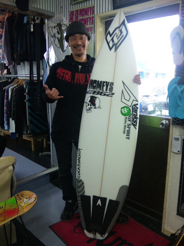 千葉は夷隅にある SURF SHOP ホーミーズ! ここは仲間同士で経営しているアットホームなサーフショップ! ここの2人はオモロい奴らで、Tomo君は腕の良いシェイパー! 現在ジャスティスのシェイプも行っている。 相棒のRYOは、BGZのライダーでもあり、サンディングマンでもあり、アーティストでもある。 その彼らが自粛して来た海を解禁したそうだ! 自分もあれ以来海に入っていないが、波が上がれば入りたい。 また海で楽しい笑顔が戻る日まで、踏ん張るべ! それにしても写真のサーフボード。 ノーズに張られたBGZステッカー! デカくねぇ〜(笑) ![]()